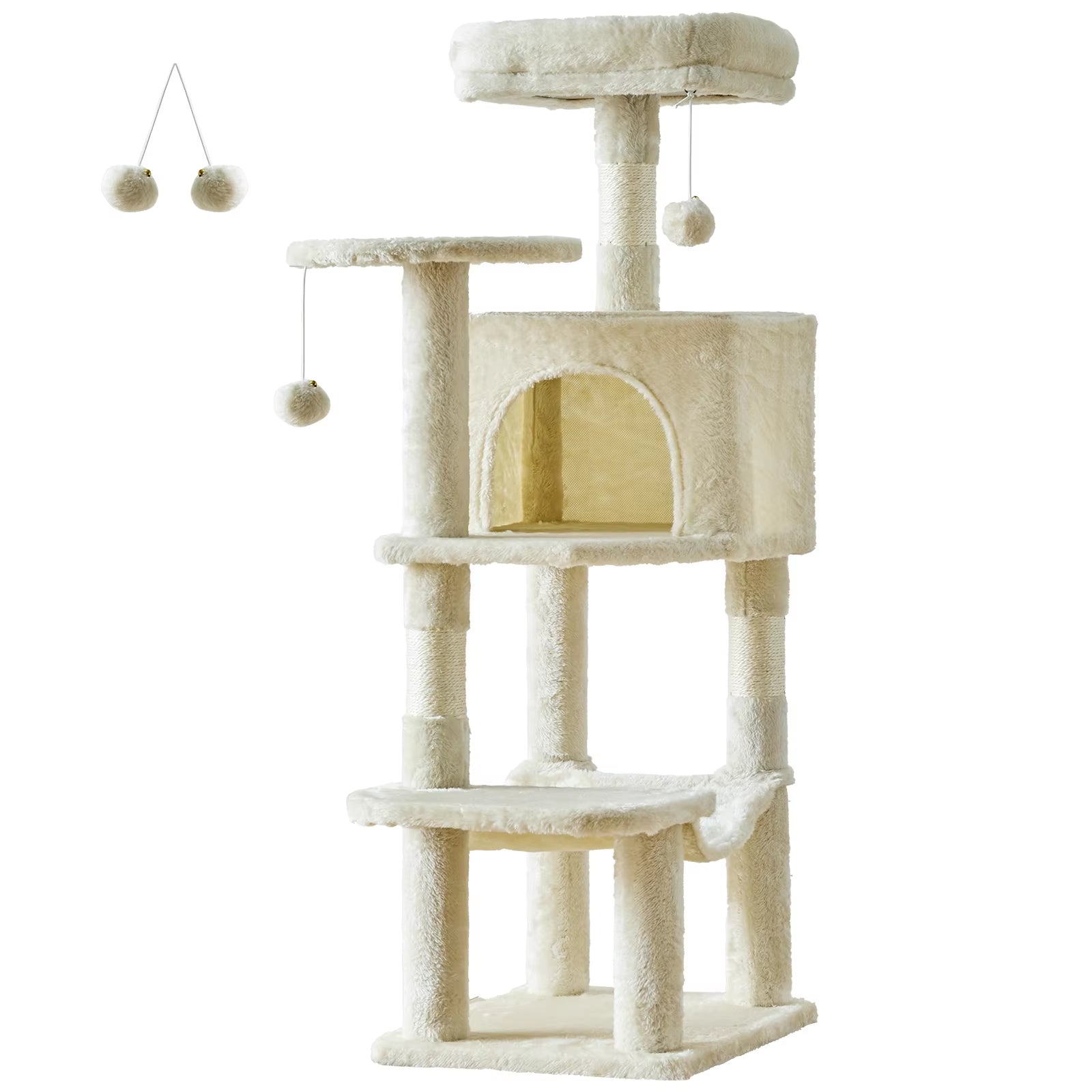 Cozy Resting Areas Plush surfaces offer comfort for lounging and cat naps